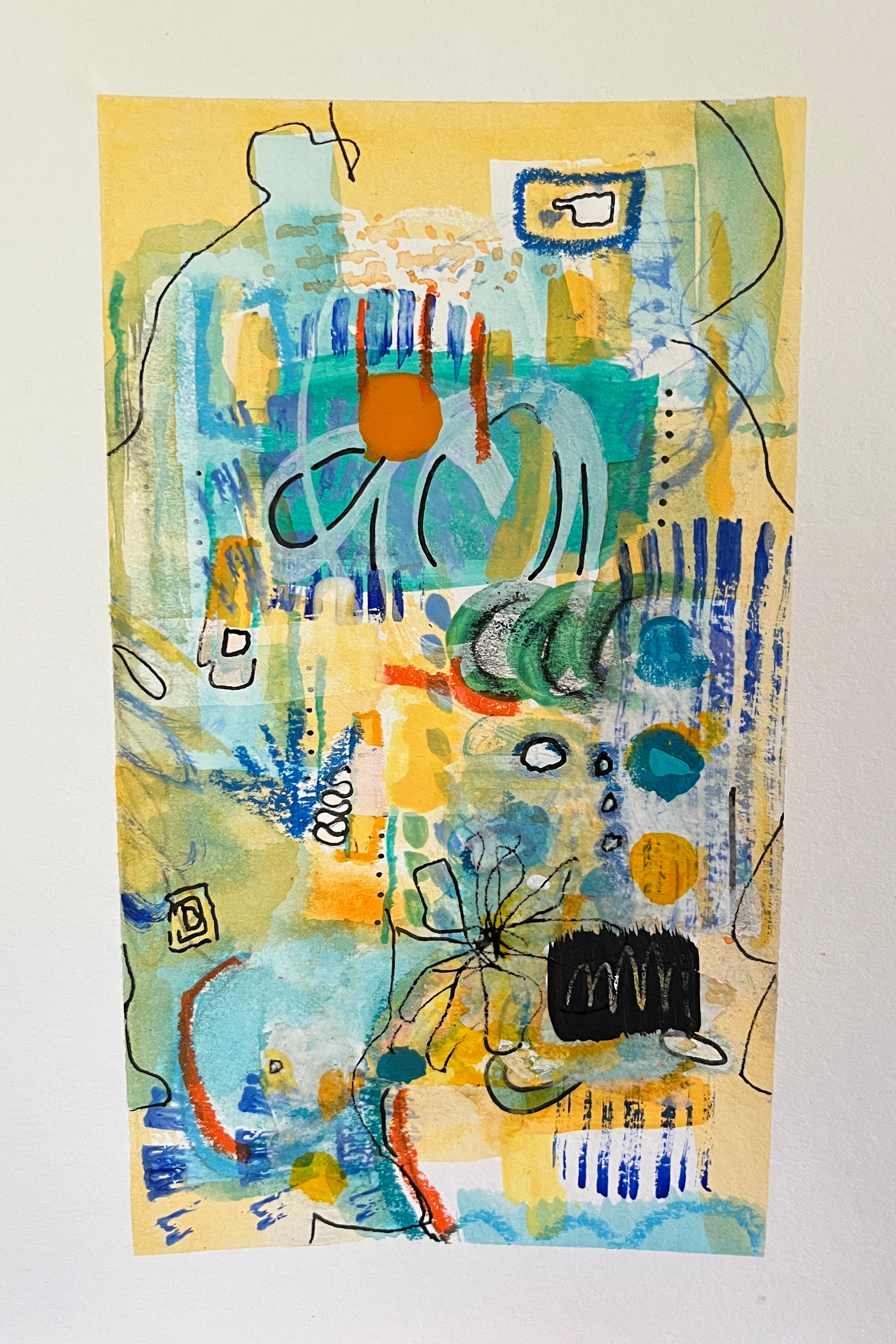 This is an original, mixed media painting: acrylic, collage, ink and oil pastels on watercolor paper.